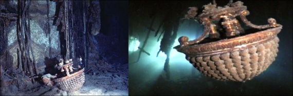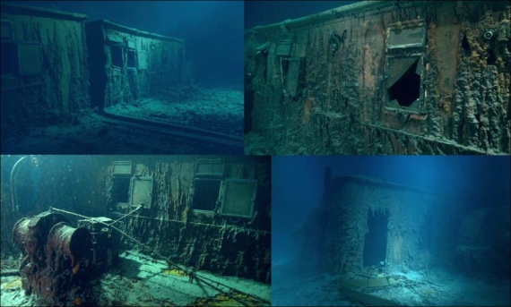 Титаник затонул в Атлантике на глубине почти 4 км. Во время погружения под воду судно разломилось на две части, которые сейчас лежат на дне примерно в шестистах метрах друг от друга. Вокруг них разбросано множество обломков и предметов, в т.ч. и довольно таки большой кусочек корпуса Титаника.