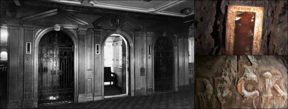 За лестницей размещалось несколько лифтов для пассажиров 1-го класса. От них сохранились отдельные элементы. Надпись, изображенная внизу справа, размещалась напротив лифтов и обозначала палубу. Это надпись принадлежала палубе А; бронзовая буква А уже отвалилась, но следы от нее остались.
