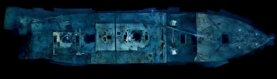 Панорама носовой части, собранная из нескольких сотен снимков. Справа налево: прямо над кромкой носа торчит лебедка запасного якоря, за ней находится швартовное устройство, сразу за ним открытый люк в трюм №1, от которого расходятся к бортам линии волнореза. На межнадстроечной палубе лежит поваленная мачта, под ней находятся еще два люка в трюмы и лебедки, для работы с грузом. В передней части основной надстройки раньше был капитанский мостик, который развалился во время падения на дно и теперь угадывается теперь лишь по отдельным деталям. За мостиком сохранилась надстройка с каютами офицеров, капитана, радиорубкой и пр., которую пересекает трещина, образовавшаяся на месте деформационного шва. Зияющая дыра в надстройке — место под первую дымовую трубу. Сразу за надстройкой видно еще одну дыру — это колодец, в котором находилась парадная лестница. Левее расположено что-то очень рваное — там была вторая труба.