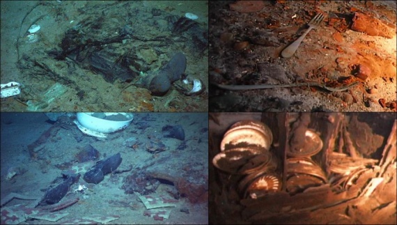 По океанскому дну разбросаны сотни предметов, начиная от деталей судна и заканчивая личными вещами пассажиров.