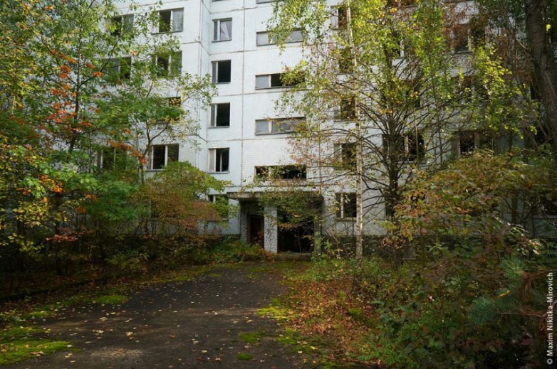 Дом сохранился достаточно хорошо, по его подъезду можно ходить без опасения, что перекрытия «сложатся» под ногами. С улицы фасад выглядит вот так, типичная картина для современной Припяти — заросли полесских джунглей, среди которых, если присмотреться, можно неожиданно разглядеть остовы высотных домов.