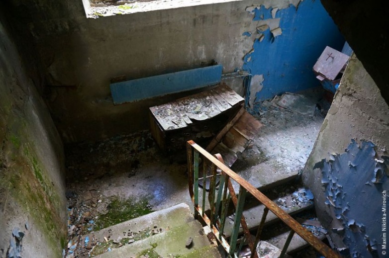 Подъезд впечатляет. Впечатляет прежде всего тем, как природа начинает отбирать свое у человека (я еще напишу об этом подробнее в отдельном посте про Припять). По стенам стекают водопады воды, везде много видов плесени и мха.