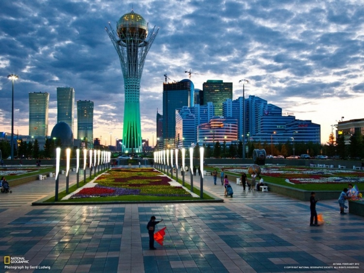 Байтерек, возвышающийся над центральной улицей в Астане, горит зеленым на фоне вечернего неба. Этот 96-метровый памятник является символом новой столицы, но напоминает огромное дерево с золотым яйцом в ветвях. По казахской легенде, священная птица каждый год откладывает яйцо в ветвях тополя