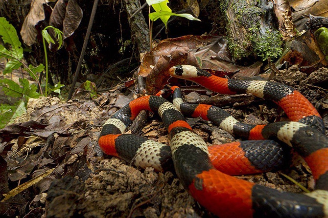 Яркие цвета а-ля коралловая змея дают Erythrolamprus aesculpi защиту от хищников, хотя этой змее не хватает смертельного яда, который есть у реальных коралловых змей. Это одна из 19 змей, найденных во время экспедиции.