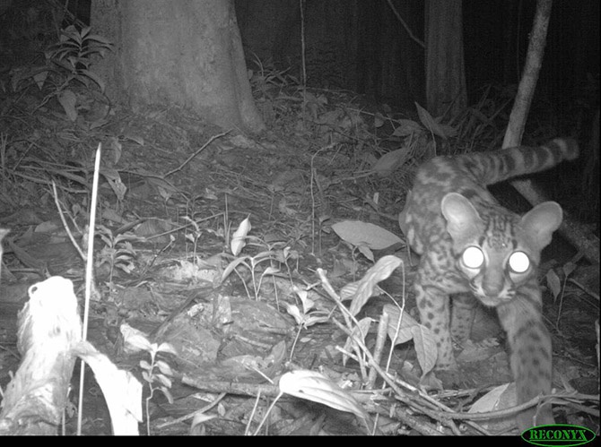Из-за того, что многие млекопитающие очень неуловимы и их трудно увидеть в лесу, ученые используют автоматизированные камеры-ловушки. Камера обнаруживает животное при помощи инфракрасного датчика и спускает затвор. Из 24 крупных видов млекопитающих, встреченных в экспедиции, многие были обнаружены с помощью таких камер-ловушек. А это длиннохвостая кошка (Leopardus wiedii).