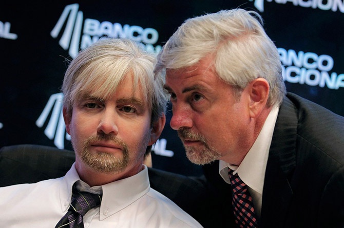 Датский учёный Henrik Scharfe (справа) позирует со своей точной копией, гуманоидным роботом Geminoid-DK, во время презентации на Национальной олимпиаде роботов в Сан-Хосе, штат Калифорния, 16 августа 2013 года.
