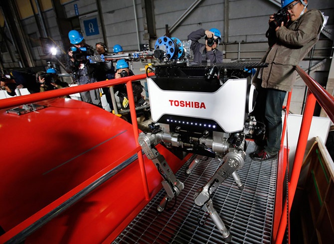 Репортёры фотографируют нового робота Toshiba, который, по словам разработчиков, способен проводить исследовательские и восстановительные работы на аварийной АЭС «Фукусима-1», во время пресс-показа в Иокогаме, 21 ноября 2012 года.