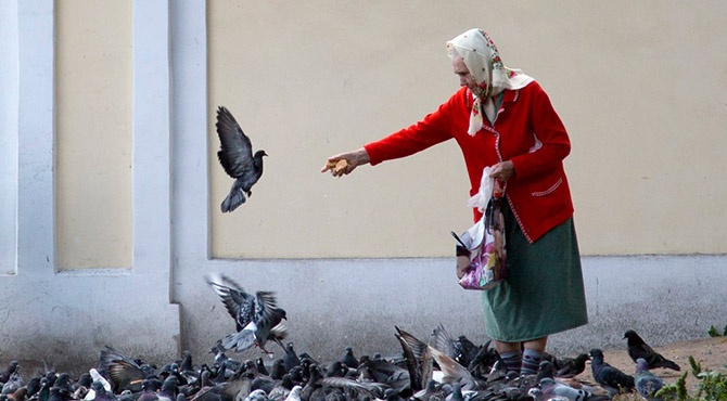 Бабушка кормит голубей рядом с Александро-Невской лаврой в Санкт-Петербурге, 3 сентября 2013.