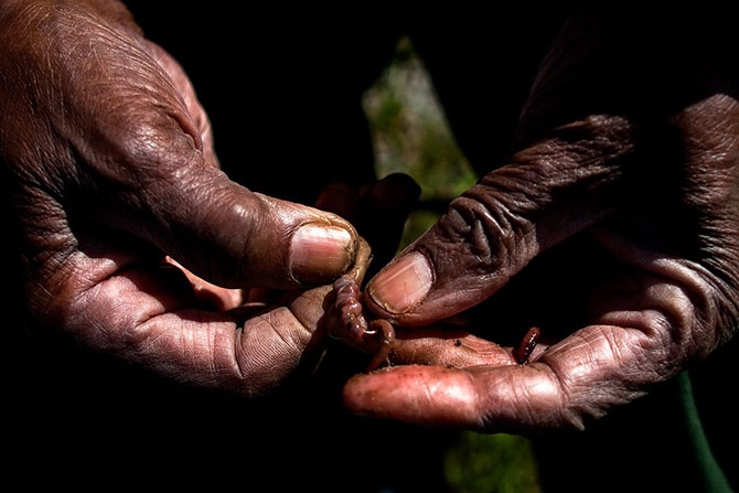 79-летняя жительница штата Мичиган готовится к рыбалке, насаживая на крючок приманку, 16 сентября 2013. Впервые она взяла в руки удочку в 12 лет.