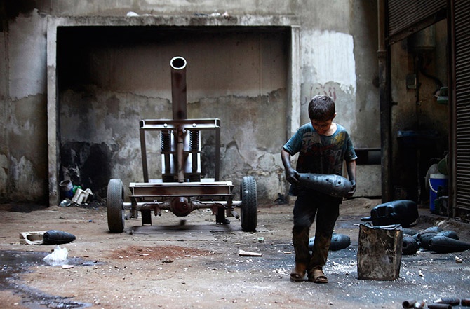 10-летний мальчик тащит минометный снаряд, Алеппо, 7 сентября 2013. Он работает с отцом на заводе по 10 часов каждый день, кроме пятницы. Так выглядит повседневная жизнь многих детей в Сирии.