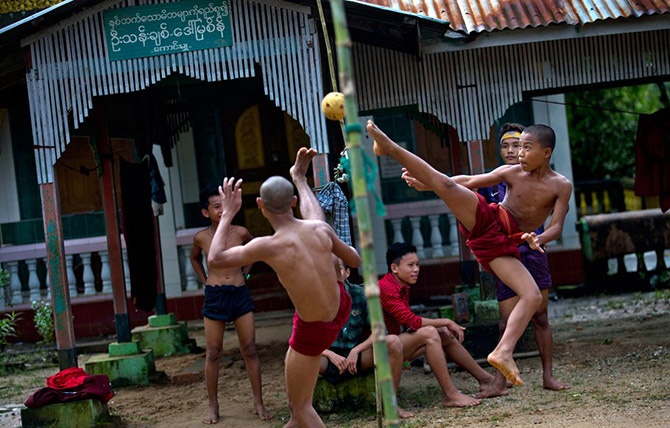 Буддистские монахи демонстрируют мастерство игры в Чинлон. Мьянма, 29 сентября 2013. Этой игре уже более полутора тысяч лет, изначально она считалась игрой королей. Это национальный вид спорта в Мьянме, сочетающий в себе спортивные элементы и танец.