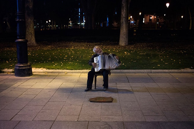 Румынский музыкант играет на аккордеоне на улице перед Королевским дворцом, Мадрид, Испания, 25 сентября 2013.