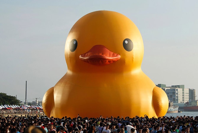 Огромная резиновая утка в порту Гаосюн, Тайвань, 19 сентября 2013. Эта «игрушка» — арт-проект голландского скульптора Флорентина Хофмана. «Резиновая утка не знает границ, не проводит различий между людьми и не имеет политического подтекста». Высота утки составляет 16.5 метров.