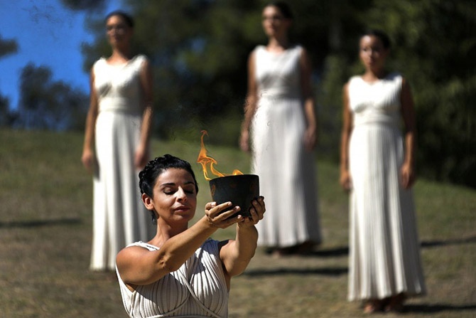 В воскресенье, 29 сентября на развалинах храма богини Геры, в древнем городе Олимпия, который дал название играм, прошла церемония зажжения Олимпийского огня от солнечных лучей с помощью параболического зеркала. В этой церемонии участвовали несколько десятков переодетых жриц.