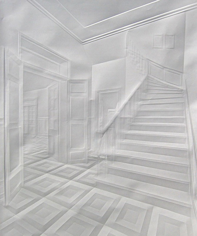 Никакой краски или чернил, простой белый лист. Складывая, перегибая, продавливая бумагу, немецкий скульптор создает линии, углы и даже круги, которые могут выделяться над поверхностью всего лишь на несколько миллиметров. Картина открывается зрителю лишь при правильном освещении.
