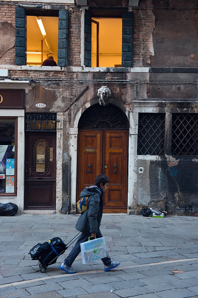 Солнце Италии побеждает: Венеция вновь сменяет маску. Сейчас на весёлую, беспечную. Венецианцы, нарядные, строгие, спешат на работу. Продавать золото, сдавать комнатушки с полузатопленными иллюминаторами за баснословные деньги, дирижировать туристами. А кто-то просто торопится в школу...