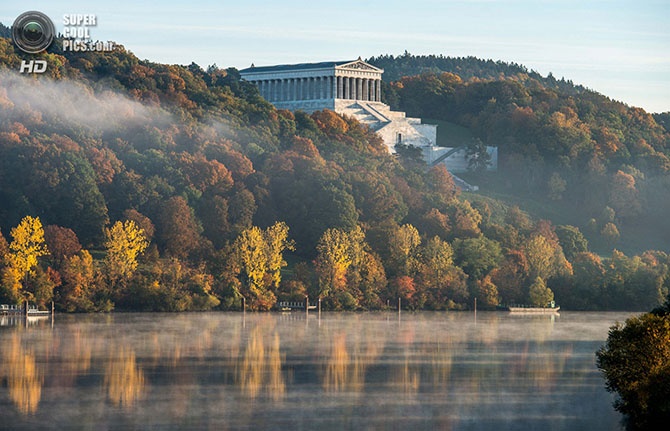 Вид на Зал Вальхаллы с берега реки Дунай. Германия. Донауштауф, Бавария.
