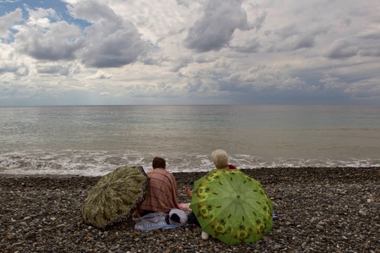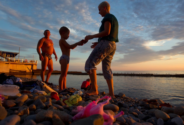 Отдыхающие на пляже у Олимпийского парка в Адлере.