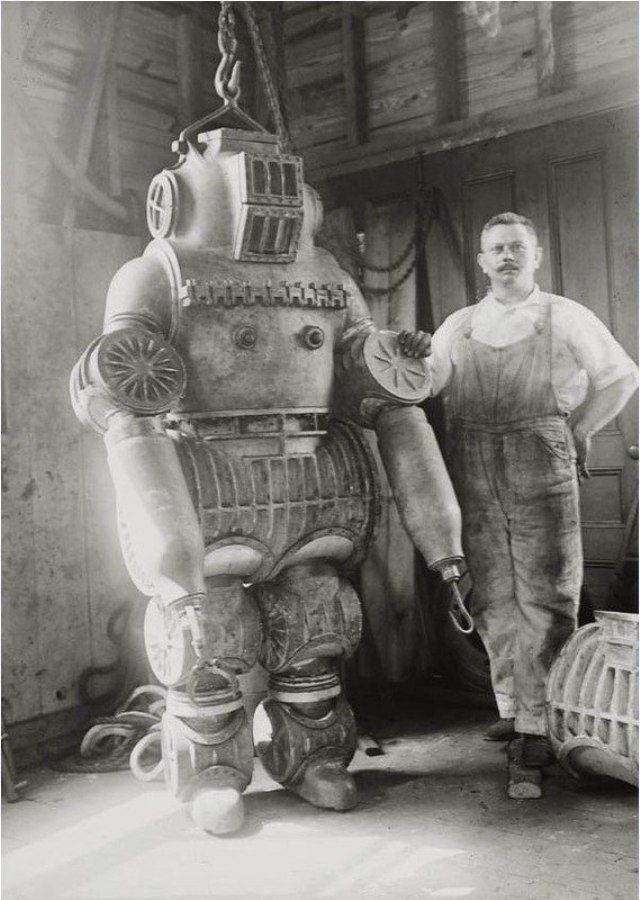 1911 г. Изобретатель Chester E. Macduffee около запатентованного им водолазного костюма весом 230 кг