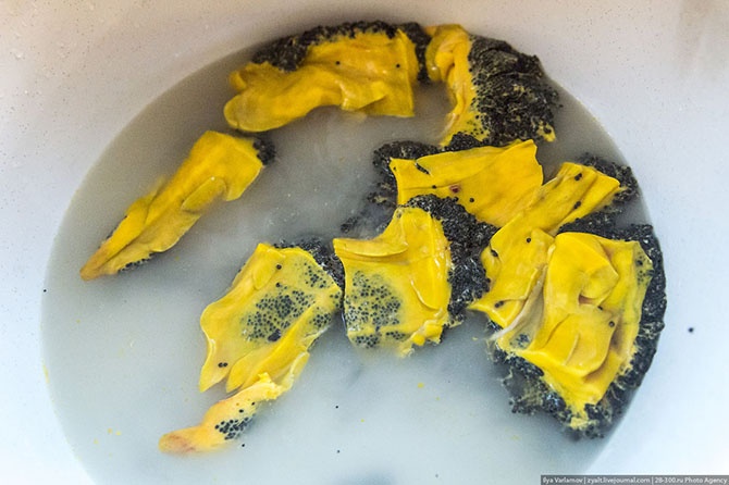 Потом рыбку протыкают специальной трубкой и достают несколько икринок, чтобы проверить качество. Если все ок, рыбу готовят к разрезанию.