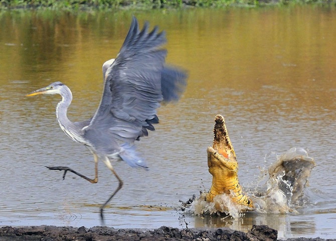 Серая цапля неудачно выбрала место для рыбалки, но успела сбежать от нильского крокодила. Кения.