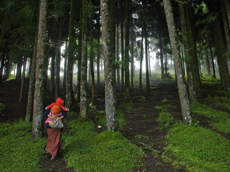 19. В крошечном буддистском королевстве Бутана охрана окружающей среды является одним из «четырех столпов Национального счастья», а также разумное развитие, сохранение культуры и правильное правление. Высокая плата за въезд позволяет сохранить такие красивые места, как этот восточный лес, через который на этом фото Кунзанг Чоден идет со своим 9-летним ребенком – свободными от толп туристов. (Lynsey Addario)