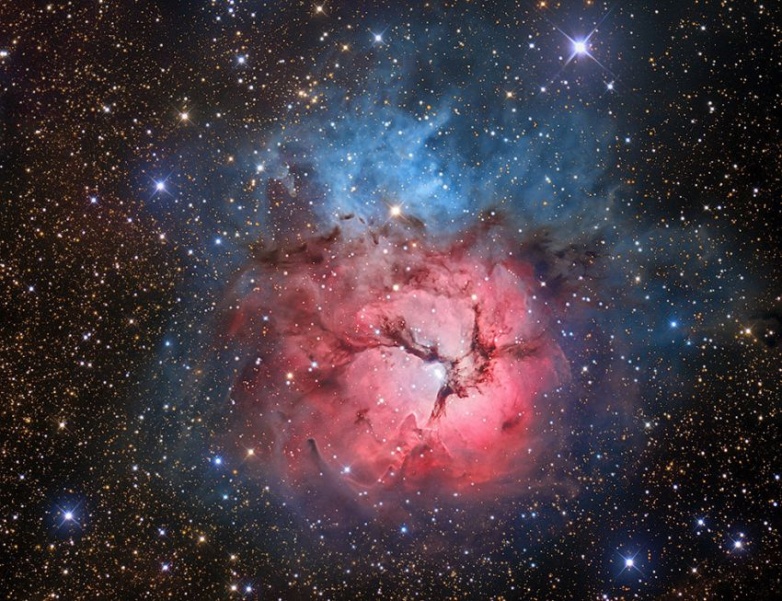 Прекрасная тройная туманность NGC 6514 в созвездии Стрельца. Название туманности предложено Уильямом Гершелем и означает «разделенная на три лепестка». Точное расстояние до нее неизвестно, но по различным оценкам составляет от 2 до 9 тысяч световых лет. NGC 6514 состоит сразу из трех основных типов туманностей — эмиссионной (розоватый цвет), отражающей (голубой цвет) и поглощающей (чёрный цвет). (Фото Máximo Ruiz):