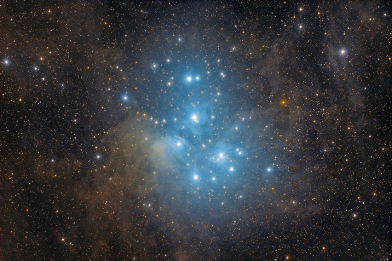 Рассеянное скопление в созвездии Тельца, иногда именуемое «Семь сестер»; одно из ближайших к Земле и одно из наиболее заметных для невооружённого глаза звездных скоплений. Пожалуй, это самое известное звездное скопление на небе. Звездное скопление Плеяд имеет около 12 световых лет в диаметре и содержит около 1 000 звезд. Общая масса звезд скопления оценивается в примерно 800 масс нашего Солнца. (Фото Roberto Colombari):