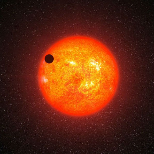 Возраст планетной системы оценивается в несколько миллиардов лет. Масса планеты составляет примерно 6,55 масс Земли, в то же время диаметр планеты превышает земной более чем в 2,5 раза. На этой картинке показано, как художник представляет себе прохождение сверхземли Глизе 1214b по диску своей звезды. (Фото ESO, L. Calçada):