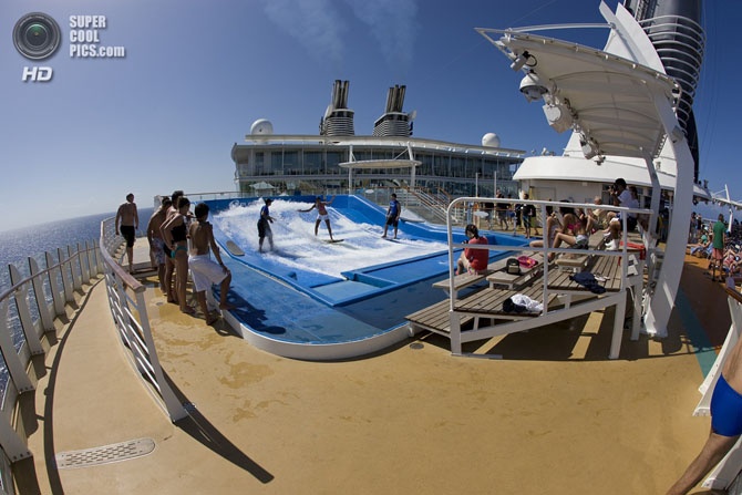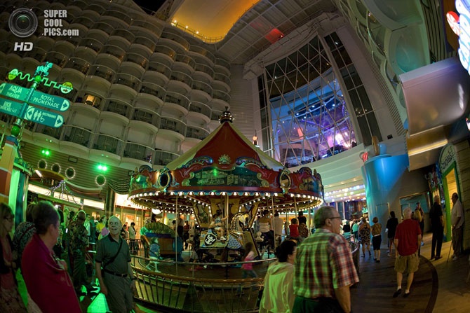 Круизное судно «Oasis of the Seas» считается самым большим в мире. Его длина составляет 361 метр, ширина — 66 метров, водоизмещение — 225 000 тонн. Давайте прогуляемся по нему.