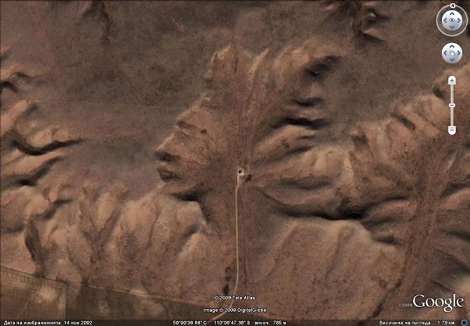 Чтобы полюбоваться на огромное изображение головы индейца с чем то, напоминающим наушники аудиоплейера, можете ввести в Google Earth координаты 500’38.20» северной широты и 1106’48.32» западной долготы.