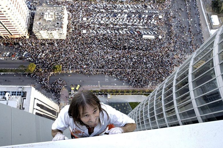 Французский скалолаз и покоритель небоскрёбов Ален Робер на здании Бурдж-Халифа высотой 828 метров. Дубаи, ОАЭ.