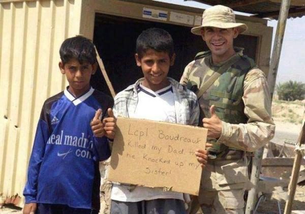 Апрель, 2004: Фотография, которая наделала много шума в Интернете. На картинке написано «Десантник Бордо убил моего отца и изнасиловал сестру». Во время допроса солдат отрицал эту надпись, говоря, что на самом деле там было написано «Добро пожаловать, морские пехотинцы» Так до сих пор и не ясно, что является оригиналом