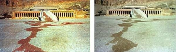 Ноябрь, 1997: После того, как террористы казнили 58 иностранных туристов в храме Хатшепсут, в Египте, швейцарский таблоид Blick вышел с фотографией ручья крови текущего из храма. На оригинале же видно, что это всего лишь вода