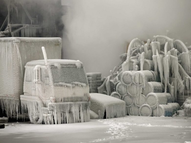 23 января пожарная бригада боролась с бушующим пожаром, возникшим на складе в Чикаго. Но из-за экстремально низких температур воздуха, склад превратился в ледяной замок.