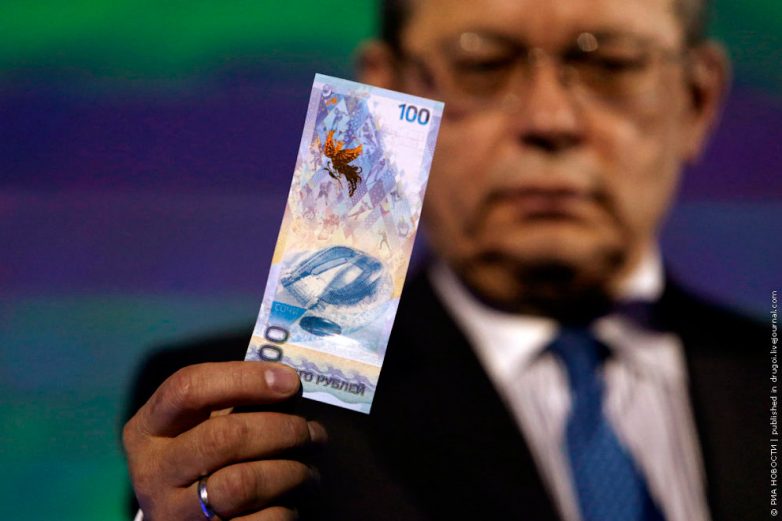 29 октября 2013 Банк России и Гознак показал «олимпийскую» сторублевку. Впервые в истории современной России у денежной купюры вертикальное расположение дизайна. Впервые в мире денежная купюра (раньше были только монеты) сделана к Зимним Олимпийским играм.