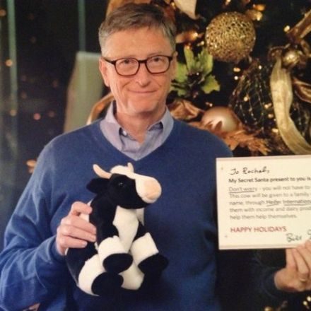 Основатель корпорации Microsoft Билл Гейтс стал «секретным Сантой» пользовательницы интернет-ресурса Reddit. К Рождеству он подарил Джо Рэйчел плюшевую корову. В поздравительной открытке пояснялось, что игрушечная корова — лишь часть подарка. От лица девушки предприниматель сделал пожертвование в благотворительный фонд Heifer International, и игрушка символизирует настоящую корову, которая будет куплена фондом на эти деньги для одной из нуждающихся африканских семьей. Кроме того, узнав из постов Рэйчел о том, что она любит путешествовать, Гейтс также подарил пользовательнице книгу National Georgaphic с описанием 500 лучших туристических маршрутов.