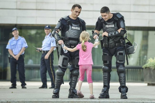 Девочка протягивает воду полицейским, Босния, 2013 год.