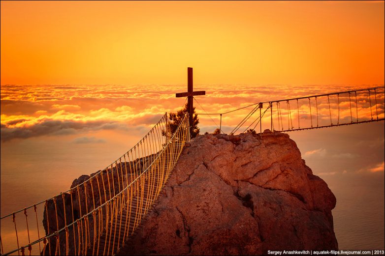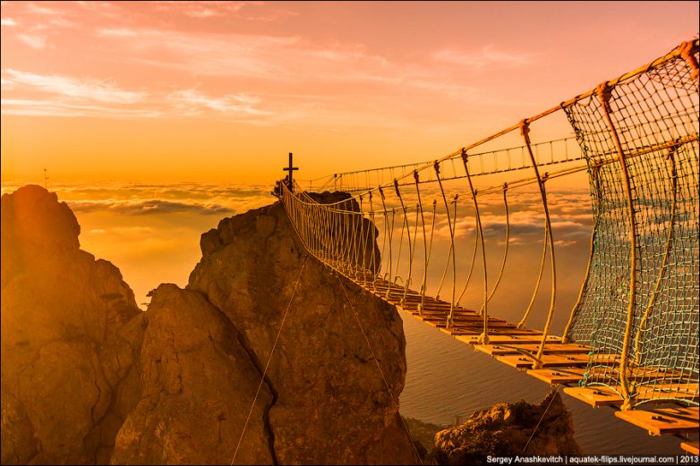 Появились эти мосты на Ай-Петри в качестве аттракциона экстремального хождения над пропастью. Кто-то принял идею на ура, кто-то категорически против. Фотографы сетуют, что испортили вид с одной из самых красивых точек на плато (но при этом активно фотографируют мосты на рассвете, ведь они внесли что-то новое в уже привычный и чуть ли не одинаковый у всех рассветный пейзаж), прокуратура в середине осени вдруг проснулась, заявив, что мосты установлены незаконно (а до того несколько месяцев и в ус не дула), и даже заповедник возмутился – как это так, на нашей территории незаконно зарабатывают деньги (и тоже не тогда, когда устанавливали мосты, а после поднявшегося осенью шума). Но все эти разборки пусть останутся разборками, я же покажу эти мосты на рассвете.