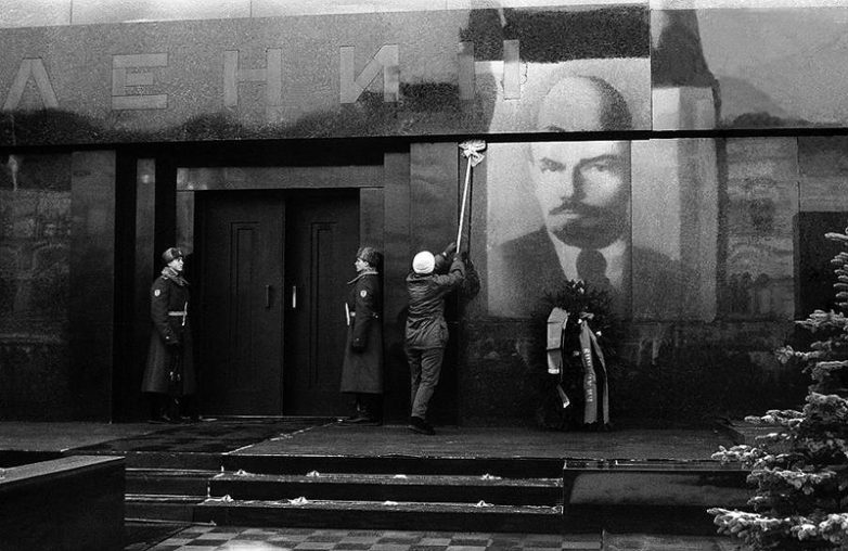 2. Мытье мавзолея Ленина к празднику. В преддверии ноябрьской демонстрации камни усыпальницы вождя приводятся в порядок, а лик его отражается в граните. 5.11.1988