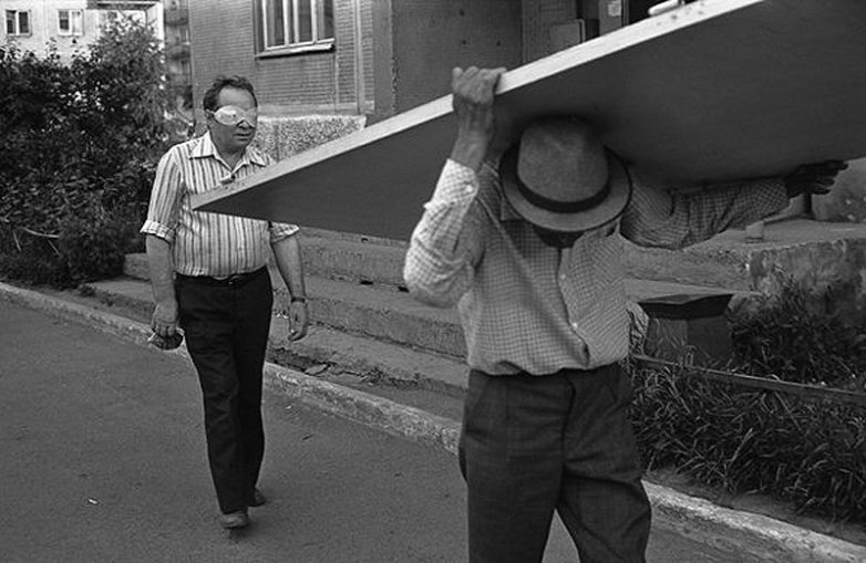 29. Полуслепой и носильщик двери. После операции мужчина носит очки, защищающие глаза от яркого света. Проспект Кузнецкстроевский. Новокузнецк. 16.07.1988