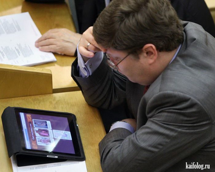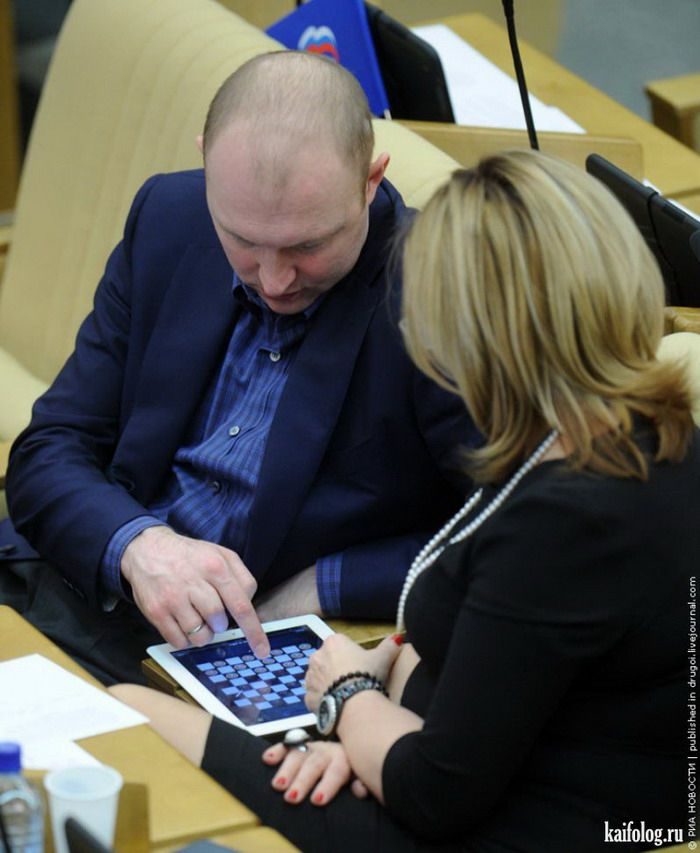 Зал полон меньше чем на четверть, а те кто есть заняты чем угодно, кроме собственно заседания и законов. Все свободно ходят по залу, болтают друг с другом, кто то читает газеты, на задних рядах вообще играют в карты. Едросня играет в айпады. Везде царит атмосфера долб*** и расп***, даже в кресле председателя Морозова. Он вообще просто чето унылым голосом читает и все.