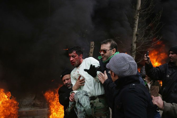 Гражданские защищают избитого демонстрантами иранского полицейского во время протестов в Тегеране, 2009 год.
