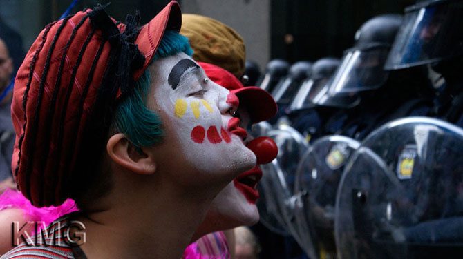Демонстранты в костюмах клоунов развлекают полицейских во время встречи большой двадцатки в Торонто, Канада, 2010 год.