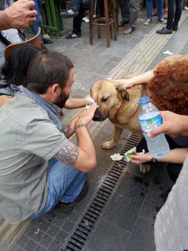 Демонстранты промывают глаза собаке, пострадавшей от слезоточивого газа, в Анкаре, 2013 год.