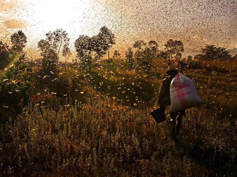 Человек идет с тяжелой сумкой сквозь рой саранчи.