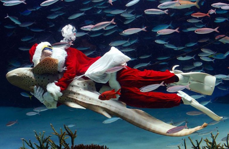 Сотрудник Токийского аквариума в костюме Санта-Клауса плавает в обнимку с зебровой акулой. AP Photo/Shizuo Kambayashi.