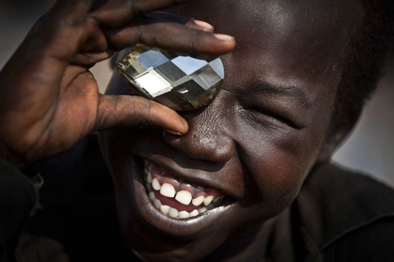 Боевые действия в столице Южного Судана Джубе вынудили мирное население искать спасение в лагерях организованных ООН для беженцев. Мальчишка попросил фотографа сфотографировать его с поддельным “драгоценным” камнем. AP Photo/Ben Curtis.