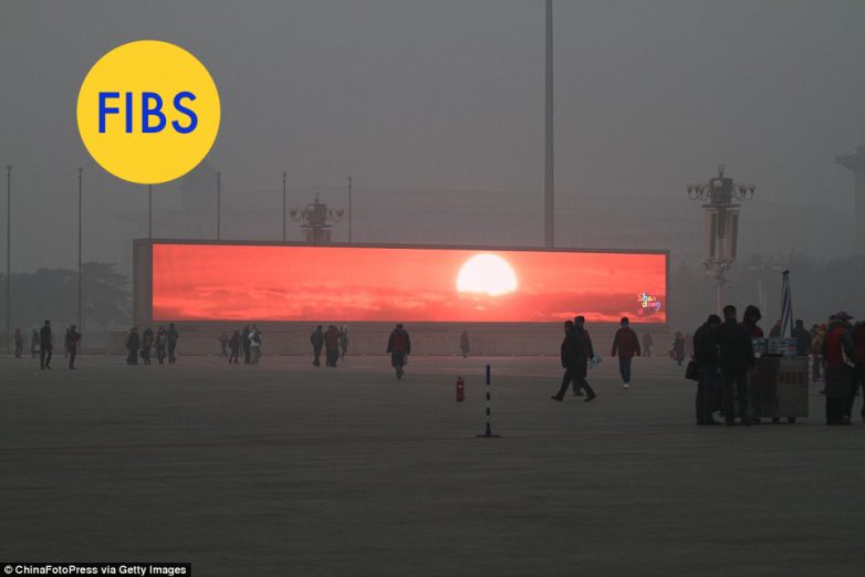 В действительности на снимке представлен рекламный видеоролик китайского туризма для провинции Шаньдун, который крутился на гигантских экранах на площади Тяньаньмэнь. Солнце же появляется в ролике на несколько секунд и является частью рекламы. Эту рекламу прокручивают в Пекине круглогодично независимо от плотности смога.