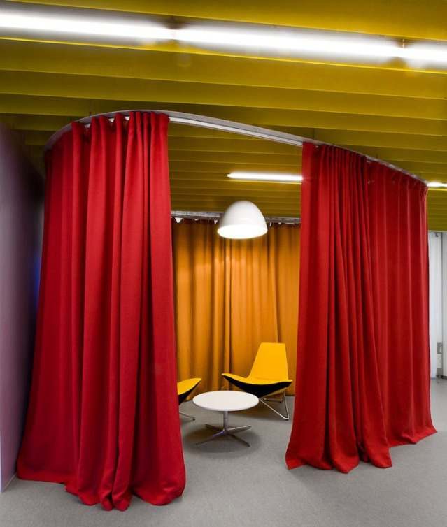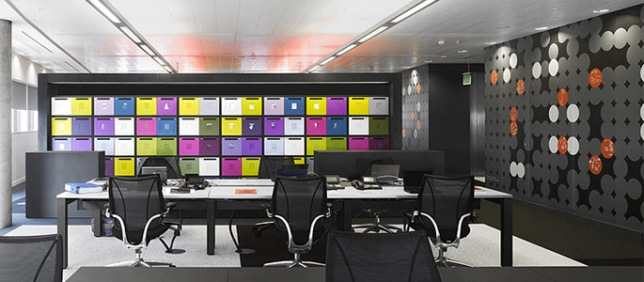 Пространство почти полностью освещено дневным светом благодаря большим стеклянным окнам. Нетрадиционная, местами веселая, раскраска интерьера также помогает работникам чувствовать себя более расслабленно.